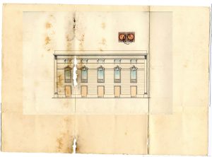 disegno su carta telata a china nera; in basso al centro a china nera, a stampatello maiuscolo (solo la prima riga, la seconda è a stampatello minuscolo): “Prospetto laterale / Scala 1:100”; in basso, angolo a destra del disegno la firma: “Vincenzo Cappello fu Carmelo”. E’ presente, in alto al centro circa, una marca da bollo da Lire due con il volto di “Umberto I. Re d’Italia” (a stampatello, tutto in giro alla testa) parzialmente coperta da un timbro circolare ad inchiostro nero al cui centro su tre righe di testo si legge: “12 / Giu / (1)911”.