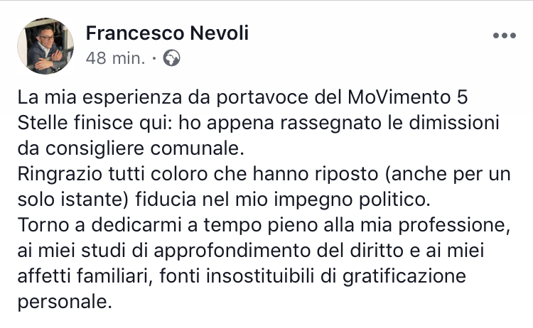 TARANTO – Si dimette dall’incarico di consigliere comunale per il Movimento 5 Stelle, Francesco Nevoli, che in un post apparso sulla sua pagina Fb scrive: