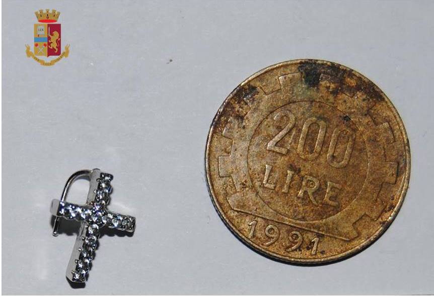 I vestiti indossati, del tutto simili a quelli descritti dalla vittima ed il suo tentativo di nascondere il volto nel cappuccio, hanno convinto i poliziotti a fermarlo ed a sottoporlo ad un accurato controllo. Lo scippatore, peraltro già noto per simili reati, è stato trovato in possesso, oltre che due banconote da 5 euro e monete di vario taglio, anche di una moneta da 200 lire del vecchio conio ed un orecchino a forma di croce in metallo bianco con piccoli zirconi, di proprietà della signora.
