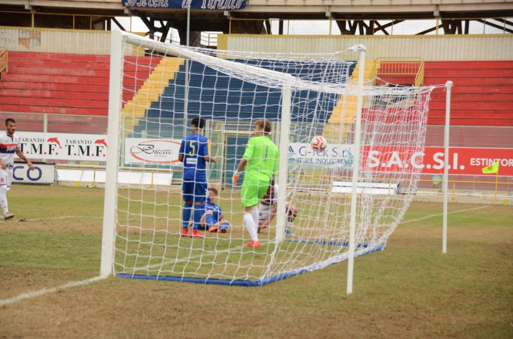 al 2′ Croce spara sul portiere Sarri. Al 4′ testa di De Cristofaro, fuori. Al 12′ rasoterra di Croce che va fuori. Al 17′ tiro di D’Agostino, a lato. Al 30′ ancora D’Agostino, a lato. Al 39′ il Taranto va in vantaggio: splendida azione con cross di D’Agostino, testa di Favetta e gol.