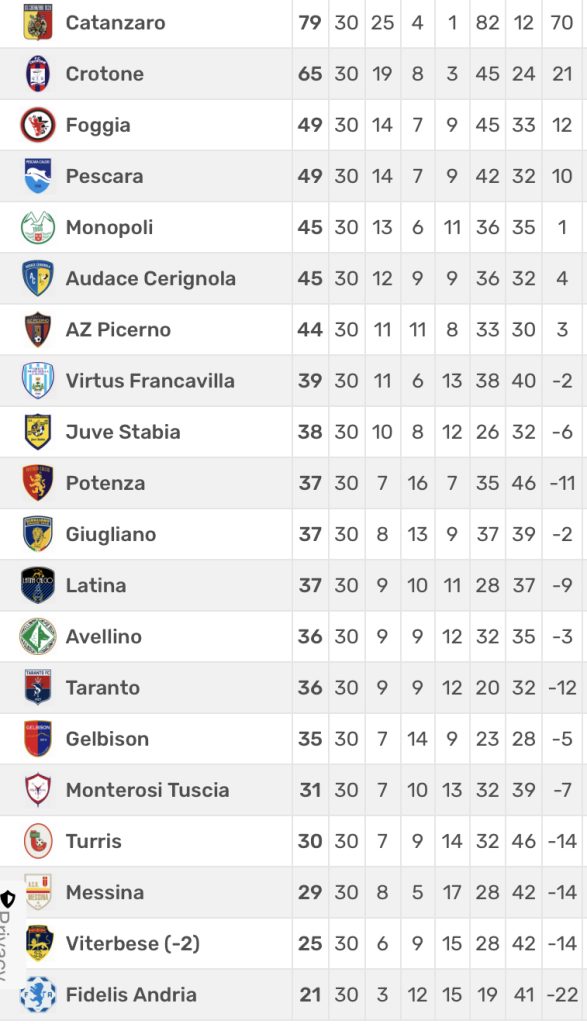 Serie C girone C, le pugliesi. Giganteggiano Foggia e Monopoli, terza la squadra dauna e quinta l’adriatica, l’Audace Cerignola, pur perdendo, resta saldamente nei play off, Virtus Francavilla, Taranto e Fidelis Andria si dividono la posta con le rispettive avversarie e restano nelle posizioni originali della classifica.