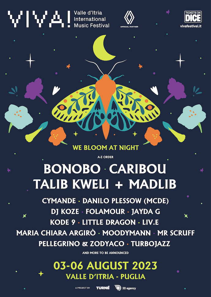 Sono già disponibili gli abbonamenti per i 4 giorni che vedranno sulla scena artisti straordinari: l’elettronica sofisticata e sognante dell’inglese BONOBO, il live di uno degli artisti elettronici più stimati dal vivo il canadese CARIBOU (che sarà sul palco del Circolo Magnolia a Milano il 13 luglio per l’anteprima milanese del festival), il leggendario duo TALIB KWELI e MADLIB, in esclusiva per l’Italia, icone della scena hip hop mondiale, lo storico gruppo funk britannico attivo dagli anni ‘70 CYMANDE, al Viva! per l’unica data italiana, l’eclettico dj fuoriclasse dei piatti DANILO PLESSOW conosciuto anche come MOTOR CITY DRUM ENSEMBLE, la creatività colorata del tedesco DJ KOZE in esclusiva per l’Italia, il francese FOLAMOUR che ha rivitalizzato la disco con il suo sound unico, il pioniere della dubstep e tra i fondatori della celebre etichetta Hyperdub KODE9, le alternative rock degli svedesi LITTLE DRAGON, l’astro nascente delle avanguardie R’n’B ‘ di Los Angeles LIV.E, la nuova promessa dello UK Jazz MARIA CHIARA ARGIRÒ, la leggenda di Detroit MOODYMANN, il set del poliedrico disc jokey e producer inglese MR SCRUFF, il jazz-funk made in Napoli di PELLEGRINO & ZODYACO, il live set del milanese TURBOJAZZ, contaminato dalle influenze del soul anni ’70 e del funk boogie degli ’80.