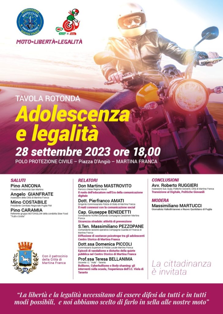 Per sensibilizzare i giovani su questi temi, il Motoclub San Martino organizza una tavola rotonda dal titolo “Moto libertà legalità”, che si terrà il 28 settembre 2023 alle ore 18,00 presso il Polo Protezione Civile di Martina Franca.