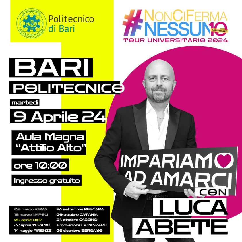 L’appuntamento con Luca Abete al Politecnico di Bari è molto più di un semplice evento universitario. È un invito a guardare oltre, a sfidare lo status quo, a credere che, insieme, possiamo davvero non farci fermare da nessuno. Bari, sei pronta a lasciarti scuotere?