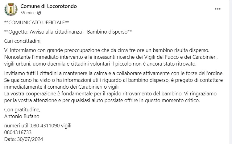 La comunità di Locorotondo è in allarme per la scomparsa di Domenico Gallo, un bambino di quasi due anni, in contrada Serralta. Al momento della scomparsa il bambino indossava una maglietta grigia, pantaloncini a quadretti blu e scarpe Adidas blu.