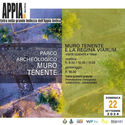Domenica prossima 22 settembre, in occasione dell’Appia Day, anche il Parco Archeologico di Muro Tenente, così come le varie località ed i vari siti posti lungo il tracciato della Regina viarum, mostrerà ai suoi visitatori, oltre alla visita guidata di quello che resta del villaggio messapico, il segmento recentemente rinvenuto della via Appia, la via consolare che conduceva da Roma a Brindisi e che è stata recentemente inserita fra i siti patrimonio mondiale dell’Unesco.
