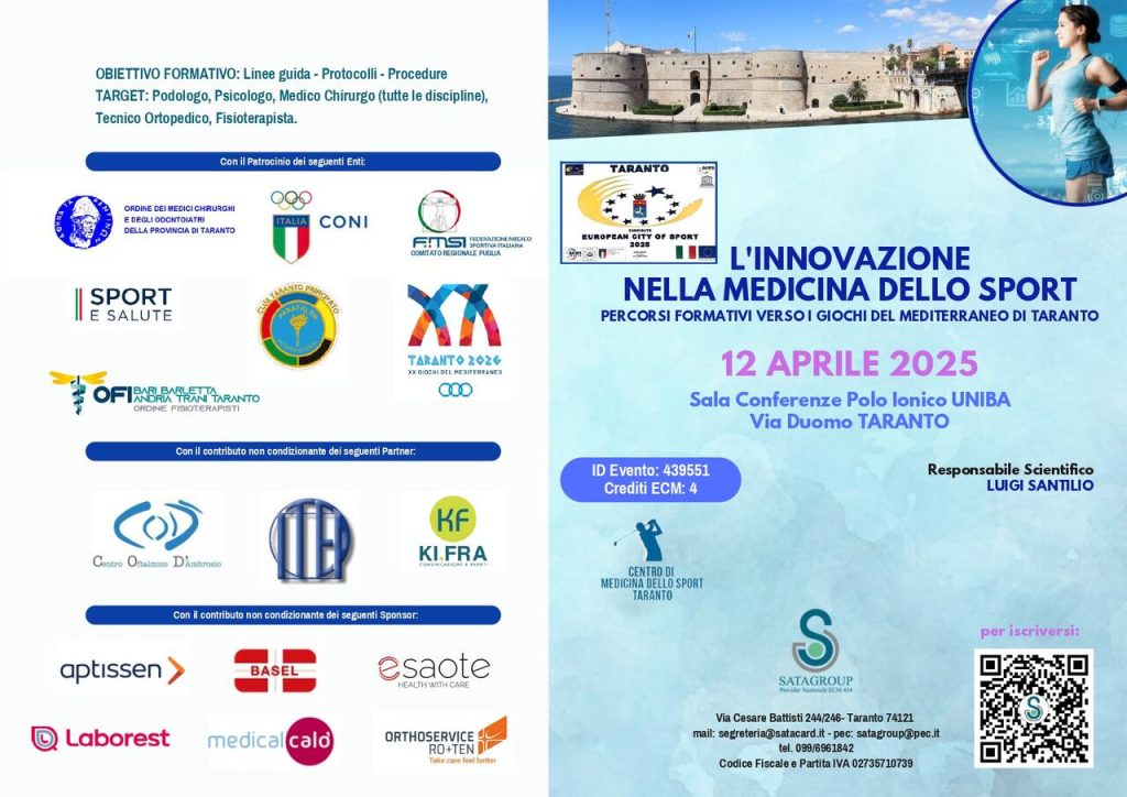 Si terrà sabato 12 aprile a Taranto, nella Sala Conferenze del Polo Ionico UNIBA, il convegno “L’innovazione nella medicina dello sport – Percorsi formativi verso i Giochi del Mediterraneo di Taranto”, promosso dal Centro di Medicina dello Sport Taranto con l’organizzazione di Satagroup. L’evento, riconosciuto all’interno del calendario di Taranto Città Europea dello Sport 2025, riunisce professionisti del settore sanitario e sportivo in tre sessioni tematiche: diagnosi, terapia e performance, per esplorare soluzioni avanzate e approcci multidisciplinari.