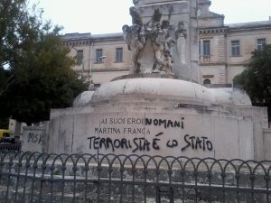 Lunedì mattina eravamo pronti a pubblicare un articolo che avrebbe documentato, ancora una volta, il degrado di Martina, sempre che ce ne fosse ancora bisogno. In passato abbiamo riportato altri articoli, una volta contro un deficiente che imbrattò tutti i muri della città, per chiedere perdono alla sua fidanzata. Quelle scritte sono ancora presenti, sperando che l’amata lo abbia definitivamente lasciato. Il titolo dell’articolo di lunedì sarebbe stato: “Siamo … Caduti in basso”. Naturalmente si giocava con la parola Caduti che aveva un doppio senso. Poi, siamo stati sorpresi dalla grande reazione apparsa su face book e sull’invito ad andare a pulire il monumento ai caduti. Il Comune di Martina già dal mattino aveva rimosso le scritte, anche se lasciando qualche alone. Nel pomeriggio, un gruppo di ragazzi ha pulito in profondità. Ora, non vogliamo malignare sul periodo che coincide con l’inizio di una campagna elettorale che appare già spigolosa, ma vogliamo dare merito ai giovani che hanno voluto dare un segnale forte. Il titolo dell’articolo è cambiato, grazie a loro. Occorre un altro segnale, è possibile che si abbia tutto il tempo per scrivere con la bomboletta spray senza essere visti? Come sapete è un reato penale punibile con la detenzione. Denunciare questi individui, anche anonimamente, sarebbe un bel segnale. Che segnale!