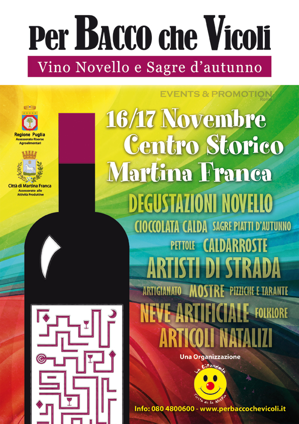 Vini novelli e non, caldarroste, pettole, carni arrosto, cioccolateria, bocconotti, prodotti da forno, involtini di trippa, fagioli e cotiche, insomma tutti quei sapori autunnali che rendono questo periodo assolutamente unico sotto il profilo enogastronomico, di scena alla manifestazione ‘Perbacco che vicoli’, patrocinata dalla Regione Puglia ed è in compartecipazione con il Comune di Martina Franca. Organizzata dall’Associazione Event and Promotion di Roma in collaborazione con l’Associazione Portici d’Italia e il Festival la Girandola che coordinerà gli artisti di strada, Perbacco che vicoli si propone come un evento che apre ufficialmente il Natale, infatti pochi giorni dopo, precisamente nel giorno di Santa Cecilia il 22 Novembre, si preparano gli alberi di Natale e si festeggia in casa assaggiando pettole condite con zucchero o con il cotto tipico della nostra zona. A Perbacco non mancheranno le bancarelle natalizie ed una esposizione di alberi veri di Natale. Dopo il successo ottenuto l’estate scorsa con Le Notti della Girandola, svoltesi presso la Corte dei Fragni, Antonio Rubino, dopo circa 20 anni, ripropone come know how della manifestazione la neve artificiale nel centro storico, una operazione di marketing che riuscì a portare in quella occasione circa 100.000 persone.