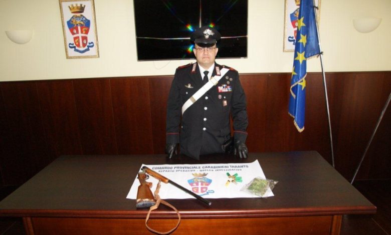 Una squadra del Nucleo Investigativo, coadiuvata da personale del Nucleo Cinofili di Modugno, ha effettuato una perquisizione domiciliare, nel corso della quale, astutamente occultati in un deposito adiacente all’abitazione, sono state recuperate 6 piante di cannabis indiana, mentre all’interno della camera da letto matrimoniale sono stati rinvenuti un fucile cal. 20 e 6 cartucce dello stesso calibro, illegalmente detenuti da un 39enne, già noto alle Forze dell’Ordine, che è stato denunciato in stato di libertà alla Procura della Repubblica del capoluogo jonico. Durante gli accertamenti è emerso che il fucile in questione era regolarmente denunciato dal padre di quest’ultimo, un 70enne, che dovrà rispondere di omessa custodia delle armi. Lo stupefacente, sottoposto a sequestro, sarà analizzato dal L.A.S.S. del Comando Provinciale dei Carabinieri di Taranto.