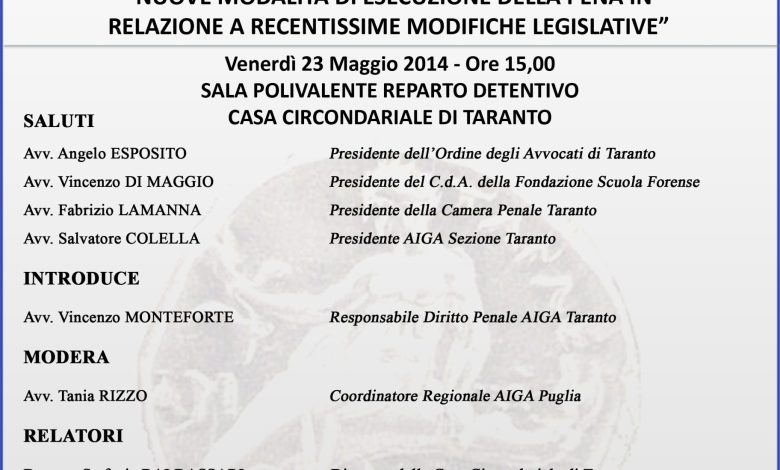 Un incontro di studio – la cui peculiarità è di svolgersi all’interno del carcere – per offrire l’occasione di riflettere sul problema del sovraffollamento carcerario e illustrare le novità normative introdotte dalla l. n. 10/2014 in tema di tutela dei detenuti, misure alternative alla detenzione, liberazione anticipata, braccialetto elettronico e dalla l. n. 67/2014 in tema di messa alla prova degli adulti. Questi gli obiettivi della tavola rotonda, organizzata dall’A.I.G.A. (Associazione Italiana Giovani Avvocati) sul tema “Nuove modalità di esecuzione della pena in relazione a recentissime modifiche legislative”, che si svolgerà venerdì 23 maggio, alle ore 15, nella Casa Circondariale di Taranto (Sala Polivalente Reparto detentivo).