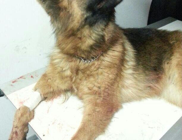 (in foto il pastore tedesco che riceve le prime cure nella clinica veterinaria)