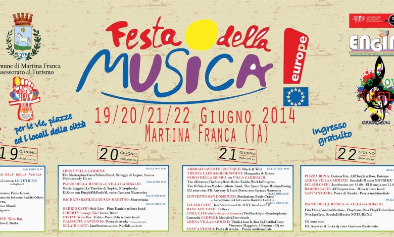 I prossimi 19/20/21/22 giugno, quindi, saranno l’occasione, per 300 città europee, 60 città italiane con Senigallia capofila, di partecipare ad un evento di grande dimensione sociale e Martina Franca sarà presente per il secondo anno consecutivo dopo il successo ottenuto la scorsa edizione, collocandosi al secondo posto fra le città italiane per numero di postazioni e gruppi musicali partecipanti. Un ringraziamento doveroso va all’Amministrazione Comunale di Martina Franca, rappresentata dall’assessore al Turismo e Spettacolo Avv. Pasquale Lasorsa, che ha fortemente voluto l’evento proposto e organizzato dall’Engine per il secondo anno consecutivo.