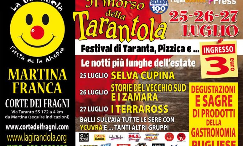 Anche quest’anno, il 25-26-27 luglio, nella splendida cornice della corte dei Fragni (la location si raggiunge facilmente uscendo da Martina Franca per andare verso Taranto, sulla SS. 172, e dopo circa 4/5 Km si svolta sulla destra – vi saranno comunque le indicazioni) si terrà la manifestazione “Il morso della Tarantola”, il più importante festival di Taranta, pizzica, e musica popolare del territorio.