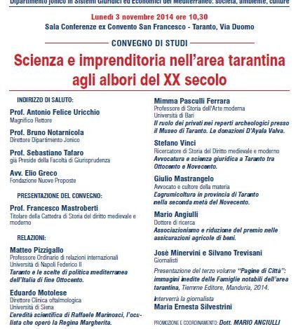 Lunedì 3 novembre 2014, alle ore 10.30, presso la sede di Giurisprudenza del Dipartimento Jonico dell’Università di Bari (Taranto, Via Duomo 259, ex Convento di San Francesco), si svolgerà il Convegno di studi su “Scienza e imprenditoria nell’area tarantina agli albori del XX secolo”, teso a porre in luce l’operato di quanti in tale periodo si sono distinti nelle professioni liberali e nell’imprenditoria, contribuendo allo sviluppo socio-culturale del territorio jonico