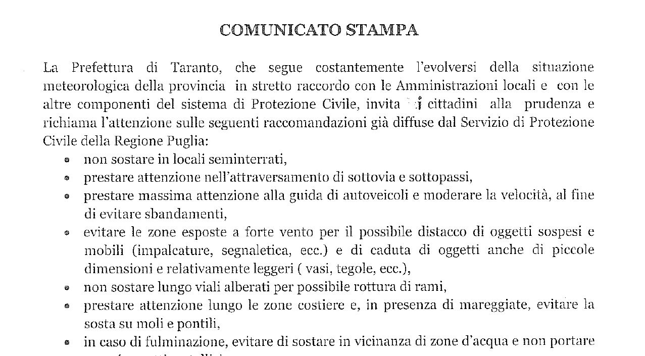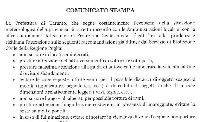 Riportiamo all’attenzione l’ultimo comunicato della Prefettura di Taranto sull’allerta maltempo diramato in serata ( leggi qui ) dalla Protezione civile.