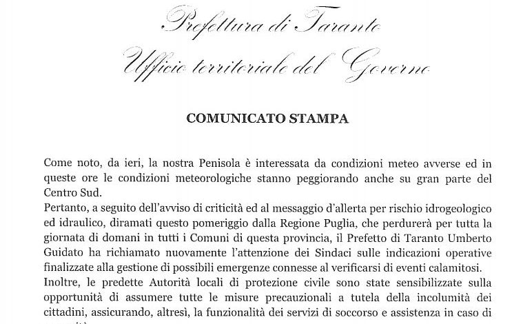 Alleghiamo la comunicazione che il Prefetto di Tarano Umberto Guidato ha fatto pervenire a tutti i Sindaci del tarantino a seguito dell’allerta meteo diramata qualche ora fa (leggi qui) dalla Protezione Civile.