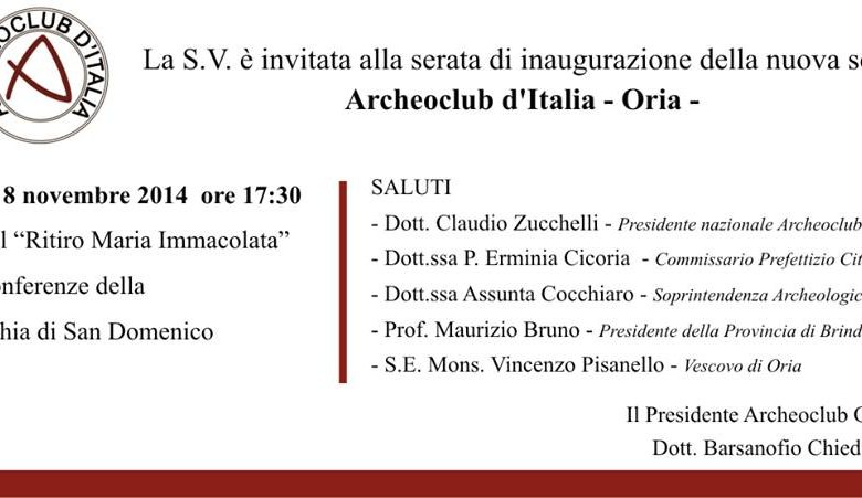 Sabato 8 novembre 2014 alle ore 17.30, nella sala conferenze del Ritiro “Maria Immacolata” presso la parrocchia “San Domenico” di Oria, la locale sede dell’Archeoclub d’Italia inaugurerà i locali che costituiranno la nuova base operativa dell’associazione, attiva in Oria fin dal 2008. All’appuntamento interverranno il dott. Claudio Zucchelli (presidente nazionale dell’Archeoclub d’Italia), mons. Vincenzo Pisanello (vescovo di Oria), il viceprefetto Pasqua Erminia Cicoria (commissario straordinario prefettizio della Città di Oria), il prof. Maurizio Bruno (presidente della Provincia di Brindisi), la dott.ssa Assunta Cocchiaro (Soprintendenza per i Beni Archeologici della Puglia) e il dott. Barsanofio Chiedi (presidente della sede di Oria dell’Archeoclub d’Italia). L’evento costituisce una tappa importante per la sede oritana dell’Archeoclub poiché i locali ora a disposizione dell’associazione permetteranno un incremento delle attività da essa curate, divenendo ancor più punto di riferimento culturale per la città e l’intero territorio.