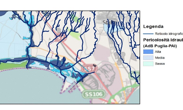 Il territorio della provincia di Taranto è relativamente povero di corsi d’acqua a portata costante. Lame, gravine e fossi posseggono un “regime torrentizio”: brevi e intense piogge possono causare esondazioni con minimi tempi di allerta. Per sapere quali corsi d’acqua e quali aree a pericolosità idraulica (alluvioni) e geomorfologica (frane, sprofondamenti) interessano le aree in cui viviamo possiamo consultare il WEBGIS del Piano di Assetto idrogeologico dell’AdB Puglia (Autorità di bacino) al seguente link: http://adbpuglia.dyndns.org/gis/map_default.phtml.