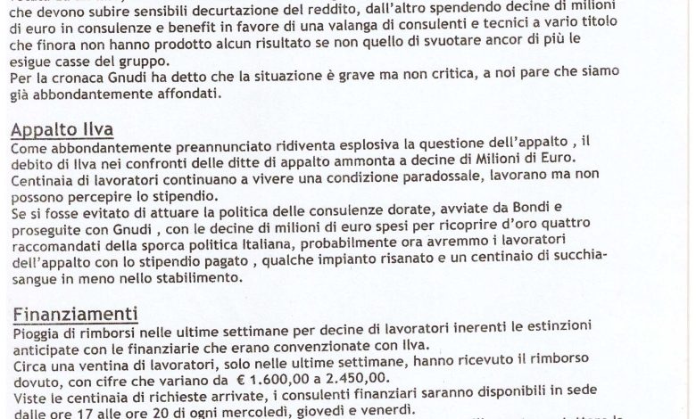 Se si fosse evitato di attuare la politica delle consulenze dorate, avviate da Bondi e proseguite con Gnudi , con le decine di milioni di euro spesi per ricoprire d’oro quattro raccomandati della sporca politica Italiana, probabilmente ora avremmo i lavoratori dell’appalto con lo stipendio pagato , qualche impianto risanato e un centinaio di succhia-sangue in meno nello stabilimento.Finanziamenti