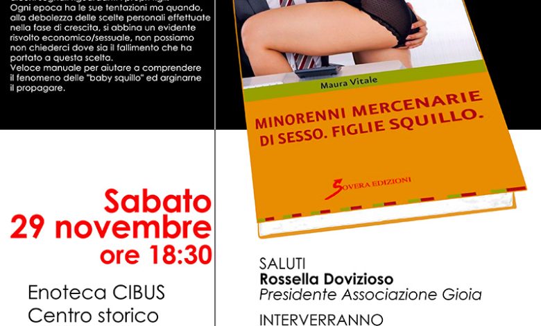 L’Associazione Gioia organizza “Aperitivo con l’autrice”, la presentazione del libro “Minorenni mercenarie di sesso. Figlie squillo” di Maura Vitale. L’evento si terrà sabato 29 Novembre, alle ore 18.30, presso l’Enoteca Ristorante Cibus di Ceglie Messapica. Un vortice di sesso, droga, soldi e Internet che travolge l’Italia, tra scandalo e morbosa curiosità, illuminando una fascia oscura della società italiana. Adulti che cercano emozioni forti, ragazzine e ragazzini che vivono il sesso in una maniera inedita. Pura merce di scambio, nessun valore, nemmeno quello della trasgressione. Ed i genitori, proprio per il ruolo che ricoprono, non sono in grado di cogliere alcuni segnali riguardanti i propri figli. Ogni epoca ha le sue tentazioni ma quando, alla debolezza delle scelte personali effettuate nella fase di crescita, si abbina un evidente risvolto economico/sessuale, non possiamo non chiederci dove sia il fallimento che ha portato a questa scelta. Veloce manuale per aiutare a comprendere il fenomeno delle “baby squillo” ed arginarne il propagare. Così Maura Vitale, psicoterapeuta e scrittrice, racconta il fenomeno della prostituzione minorile in Italia, nel suo ultimo saggio “Minorenni mercenarie di sesso. Figlie squillo” (Sovera Edizioni). L’evento sarà presentato da Isabella Vitale, avvocato. Interverranno: Maura Vitale (autrice), Angela Albanese (DS IISS “C. Agostinelli” di Ceglie Messapica), Giusi Curri (psicologa) e Francesco Nigro (avvocato). Le conclusioni ed i saluti sono di Rossella Dovizioso (Presidente Associazione “Gioia”)