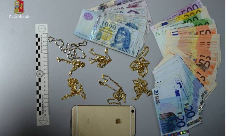 Gli immediati controlli permettevano di recuperare indosso al conducente dell’auto, il SAVA, un sacchetto di stoffa contenente sei collanine d’oro ed una busta da lettera con all’interno 3.600 euro in contanti e 200 sterline. Nel prosieguo del controllo, esteso anche alla BMW, gli agenti recuperavano nel vano portaoggetti un cellulare “IPHONE 6 plus” nuovo di zecca ed un bracciale d’oro ravvolto in un fazzoletto di carta.