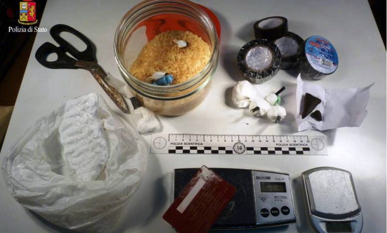 Dopo alcune ore di appostamento , i poliziotti fermavano il giovane appena giunto presso il predetto garage. Nel corso della perquisizione i “falchi” rinvenivano all’interno del box 4 involucri di plastica contenenti cocaina per un peso complessivo di circa 25 grammi, 2 pezzi di hashish del peso complessivo di 10,5 grammi e tutto il necessario per il confezionamento delle sostanze stupefacenti.