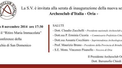 Oria: Sabato 8 Novembre inaugurazione della nuova sede dell’Archeoclub