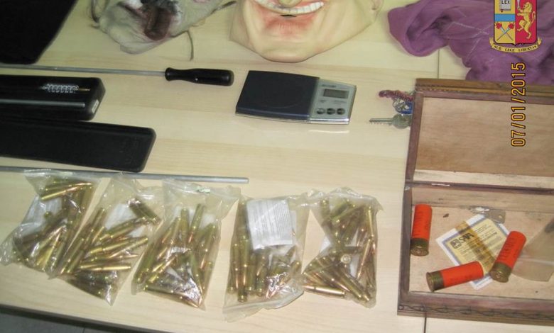 La perquisizione aveva, comunque, luogo alla presenza del legale e dei famigliari dell’uomo. Nel corso della stessa, veniva rinvenuta e sequestrata sostanza stupefacente del tipo hashish, per un perso complessivo di grammi 100 circa, un bilancino di precisione, un passamontagna e due maschere di carnevale. La perquisizione veniva, successivamente, estesa ad un casolare di campagna in uso al medesimo pregiudicato, ubicata in agro di Monteiasi. All’interno di una stanza, sotto un frigorifero, veniva rinvenuta una botola ben celata sotto uno strato di terriccio. All’interno della stessa venivano rinvenute, e sottoposte a sequestro, cento cartucce cal. 7,62 NATO, una tuta, tre cartucce cal. 12 per fucile, una fondina per pistola e materiale per la pulizia di armi lunghe. Nello stesso casolare veniva, altresì, rinvenuto un altro bilancino di precisione.