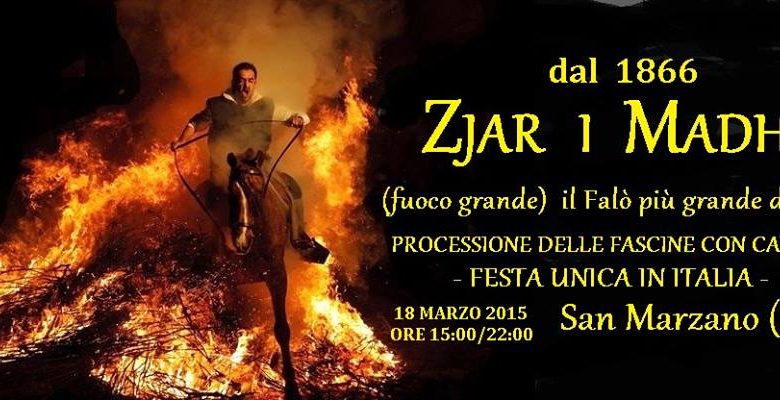 E’ uno dei Falò più suggestivi d’Italia. Alcuni esperti di storia e tradizioni ritengono che il grande “Zjar i Madhe” (in lingua Arbereshe di San Marzano significa fuoco grande) sia il più antico del Sud Italia, infatti nasce nel lontano 18 marzo del 1866 (150 anni circa). La particolarità di questo enorme Falò in onore a San Giuseppe, consiste nel trasportare enormi “fascini” di ulivo a bordo di traini, carrozze, tirati da 50/60 cavalli. Oltre ai cavalli ci sono circa 2000/3000 fedeli che trasportano sotto braccio il fascino in onore al Santo Patrono. Nella processione è presente la statua del Santo Patrono San Giuseppe, accompagnato dalle Autorità e Costumi tipici Arbereshe. La processione si snoda su un percorso di circa 3 km. Percorrendo le vie principali della cittadina di San Marzano. Durante la processione alcuni cavalli si inginocchiano davanti a San Giuseppe, lo fanno in segno di forte devozione, il tutto tra migliaia di curiosi e fedeli che giungono da ogni parte del Sud Italia. Questo rito si svolge ogni anno il 18 marzo dalle ore 15:00 alle 23:00, orario in cui viene acceso il grande “Zjar i Madhe”. L’ammasso di fascini è talmente enorme che per sistemare il tutto intervengono numerose ruspe. Vengono inoltre accesi fuochi d’artificio con base musicale. Le fiamme del Zjar i Madhe ardono fino all’alba, dando calore all’intera terra jonica salentina. Sempre durante l’inizio e la fine del falò si esibiscono le famose ronde, composte da diversi musicisti di musica popolare, che imbracciano tamburelli e fisarmoniche per intrattenere i numerosi forestieri, aggiungendo canti e balli. Evento organizzato dall’Associazione Travinieri, Comitato Festa San Giuseppe, Chiesa San Carlo Borromeo e Patrocinio del Comune di San Marzano. Molti esperti di storia ritengono che questa grande tradizione debba essere inserita nella lista dell’UNESCO. Con tutte queste straordinarie caratteristiche è unica nel suo genere in Italia.