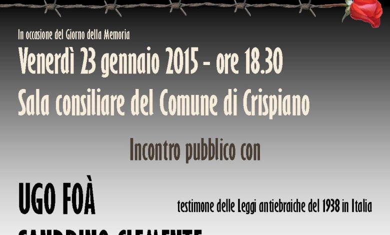 Quest’anno gli organizzatori hanno invitato a testimoniare due uomini che quella Storia l’hanno vissuta con i propri occhi. Venerdì 23 gennaio, alle 18.30, nella Sala consiliare del Comune di Crispiano (che ha dato il proprio patrocinio all’evento) avrà luogo un incontro pubblico con Ugo Foà, testimone delle Leggi antiebraiche in Italia, e Sandrino Clemente, deportato crispianese nei lager. La manifestazione avrà un suo prologo in mattinata, quando Foà incontrerà gli studenti della scuola media “F. Severi” e dell’ISISS “Elsa Morante”. Il 27 gennaio, invece, sempre in orario scolastico, il signor Clemente racconterà la propria esperienza ai più piccoli delle scuole elementari “P. Mancini” e “Giovanni XXIII”. Sostiene l’evento anche l’associazione Amici da Sempre.