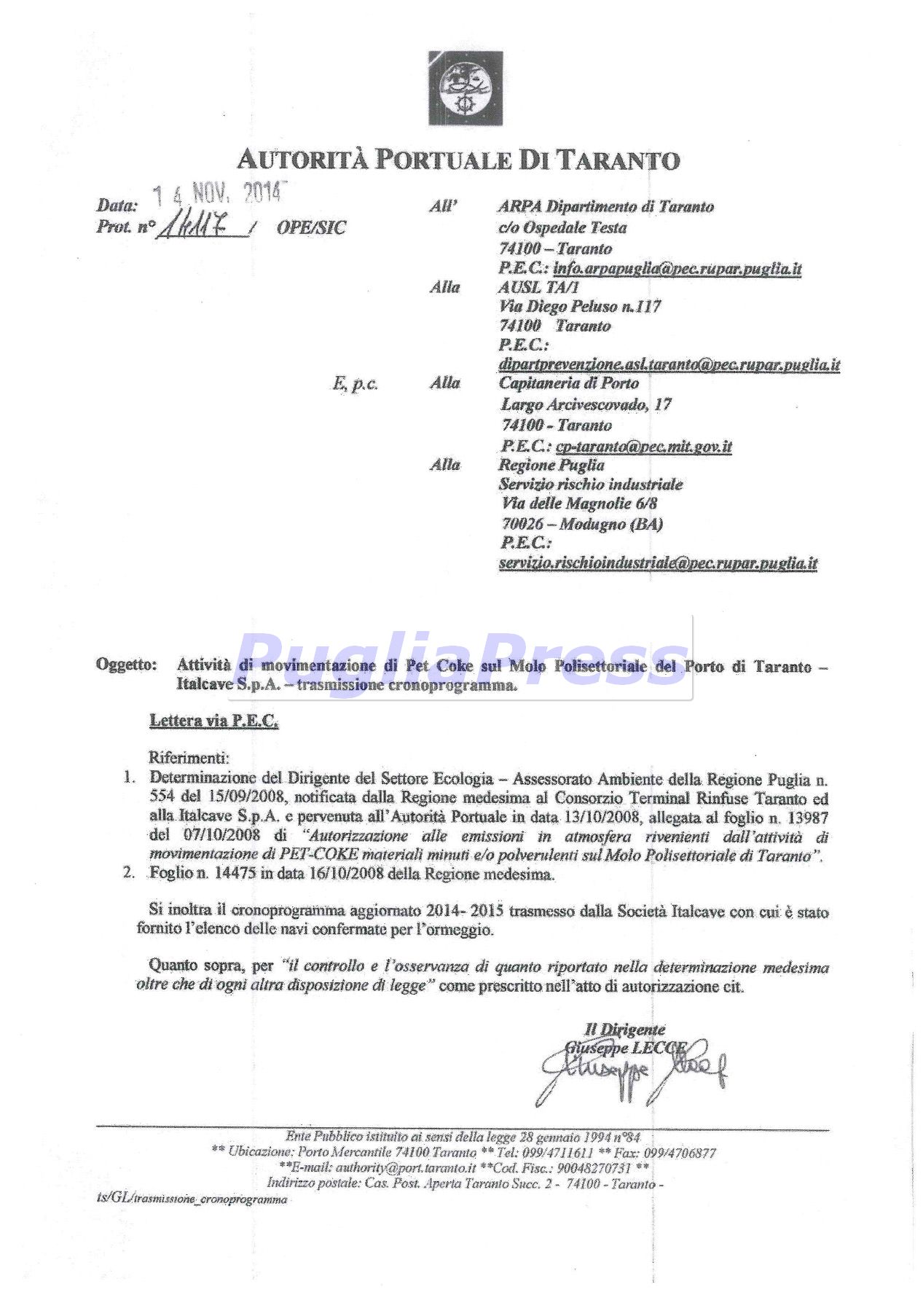Secondo il documento dell’Autorità Portuale di Taranto datato 14 novembre 2014 con numero di protocollo 14117 all’interno per molo polisettoriale ci sarebbe da un bel po’ di tempo una attività costante di movimentazione di pet-coke, un vero e proprio cronoprogramma aggiornato al 2014/2015 . Il pet-coke, il prodotto che si ottiene dal processo di condensazione per piroscissione di residui petroliferi pesanti e oleosi, arriverebbe a Taranto – ma non sappiamo da dove – stivato in containers e pronto per andare nella discarica di Italcave per essere stoccato.