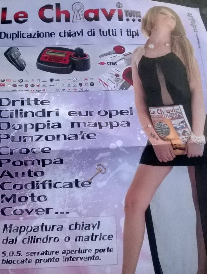Adesso però le associazioni pro donna dovranno fare i conti con un’altra attività commerciale sita a pochi chilometri da Taranto, San Giorgio Jonico. Qui un negozio ha avuto la “geniale” idea di giocare con le parole e di servirsi di una bella modella per rendere questo gioco ancora più “audace” : “Le Chiavi Tutte” è una attività commerciale che duplica ogni specie di chiavi. Ma il messaggio che arriva alla mente degli uomini è palesemente un altro.