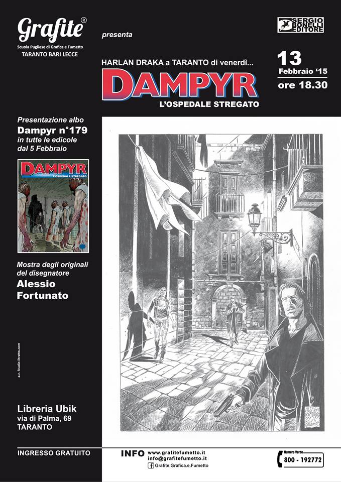 La scuola di Grafica e Fumetto Pugliese “Grafite”, ha organizzato una serata presso la libreria Ubik in via di Palma a Taranto, durante la quale presenterà l’opera del disegnatore Alessio Fortunato promuovendo una personale dell’autore, basata sulle tavole originali dell’ultimo albo a fumetti “Dampyr – L’ospedale stregato” la serie noir vampiresca della Sergio Bonelli Editore uscito nelle edicole lo scorso 5 febbraio. Sarà lo stesso Alessio Fortunato, a partire dalle 18.00 ad esporre l’albo e le sue tavole. A condurre l’evento, Marco Laggetta di Edizioni Voilier.