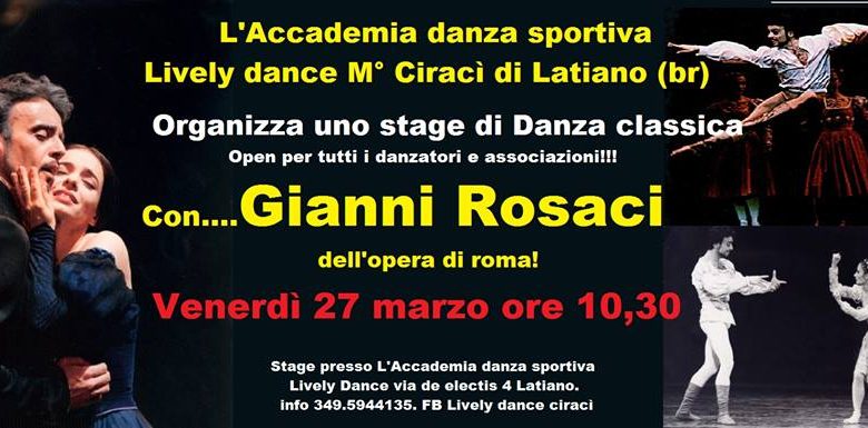 L’ACCADEMIA DANZA SPORTIVA LIVELY DANCE PRESENTA VENERDì 27 MARZO ALLE ORE 10.30 lo stage di danza classica con il grande maestro e primo ballerino dell’Operà di Roma e docente presso la scuola di danza del teatro stesso GIANNI ROSACI. Nato a Reggio Calabria l’ 11 gennaio 1962, segue gli studi presso l’ Accademia Nazionale di Danza di Roma, diplomandosi nel 1984. Contemporaneamente prende parte a tutte le produzioni del Gruppo Stabile dell’Accademia stessa. Ha danzato al fianco dei nomi più prestigiosi del panorama coreutico internazionale, quali Nureyev, Fracci, Vassiliev, Bujones, Jude, Malakov, Paganini, Bolle, tutti i maggiori balletti del repertorio classico contemporaneo. Partner di M.Illman, A.Ferri, E.Terabust, A.Alonso, C.Fracci, D.Kalfouni, ospite di galà nazionali ed internazionali, ha danzato, in tournèe con il Teatro dell’Opera di Roma, al Teatro Bolscioi di Mosca, nel maggio 2003 “La sagra della primavera” e nel 2004, al Teatro Cremlino, “Petruska”. Docente presso la Scuola di Danza del Teatro dell’Opera di Roma, è chiamato ad insegnare in numerosi stages, organizzati da scuole di livello. Dal 2010 è vicepresidente della FNASD. Ha ricevuto il “Premio Positano per la Danza”, il “Premio Città di Grosseto”, il “Premio Napoli e Danza”, il Premio “Giuliana Penzi” della Croce Rossa Internazionale, “Riconoscimento Unicef per la danza” ed il “San Giorgio d’Oro” della sua città natale della quale è stato anche tedoforo ufficiale nelle Olimpiadi invernali del 2006.