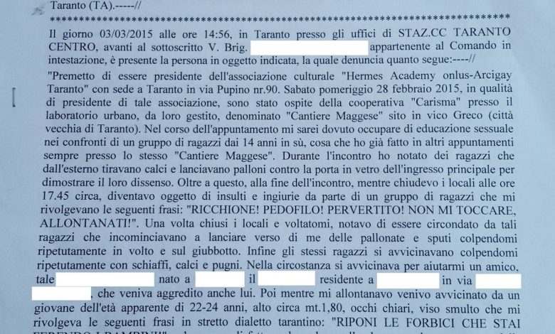 Nel pomeriggio di sabato 28 febbraio, alle ore 17:30, mentre lasciavo il Laboratorio Urbano Cantiere Maggese, al termine di una serie di attività con gli isolani (bambini, adolescenti e le loro famiglie) legate alla campagna socio-sanitaria di azione e prevenzione a malattie sessualmente trasmissibili, sono stato accerchiato da una dozzina di ragazzi dai 14 ai 24 anni circa, di identità ignota, che in un primo momento mi hanno colpito con violente e ripetute pallonate sulla schiena e sulla nuca e, poi, sputi sul volto e sul giubbotto, apostrofandomi con ingiurie come “Ricchione!”