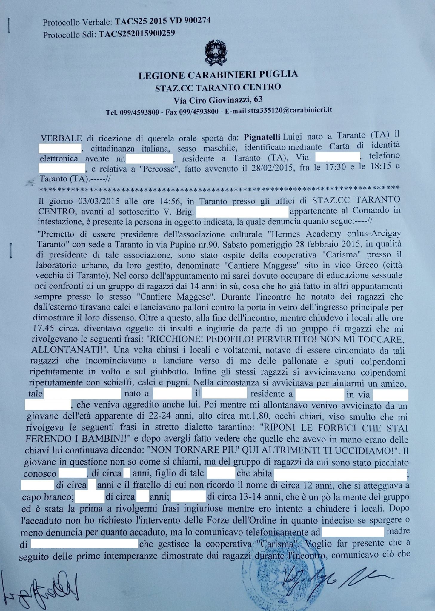 “Sei un ricchione, frocio, pedofilo e pervertito” e lo picchiano. Eccola la querela di Pignatelli
