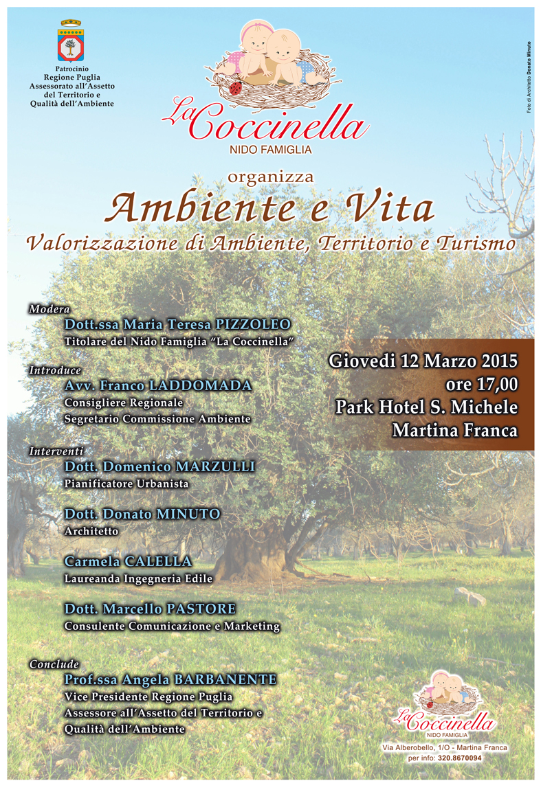 Si terrà giovedì 12 marzo, alle ore 17, presso il Park Hotel S. Michele di Martina Franca, organizzato dalla Dott.ssa Maria Teresa Pizzoleo, titolare del Nido Famiglia La Coccinella, il convegno su “Ambiente e vita: valorizzazione del territorio e del turismo”, che verrà introdotto dal Consigliere Regionale, Avv. Franco Laddomada, Segretario della Commissione Ambiente della Regione Puglia, cui seguiranno gli interventi, sotto il profilo tecnico-professionale, dell’Arch. Domenico Marzulli (Pianificatore Urbanista), dell’Arch. Donato Minuto, della Laureanda in Ingegneria Edile Carmela Calella, del Dott. Marcello Pastore (consulente comunicazione e marketing); concluderà il Vice Presidente della Regione Puglia, nonché Assessore Regionale all’Assetto del Territorio e Qualità dell’Ambiente, Prof.ssa Angela Barbanente.