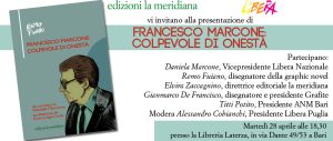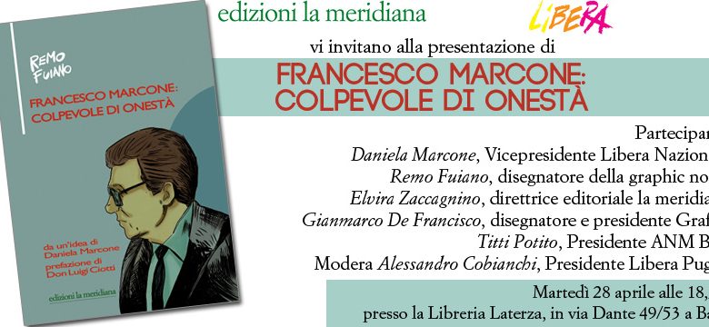 Martedì 28 aprile alle ore 18.30, presso la libreria Laterza di Bari, Libera Puglia in collaborazione con la casa editrice “la meridiana”, presenta la graphic novel “Francesco Marcone, colpevole di onestà”. Il libro nasce da un’idea di Daniela Marcone, figlia di Francesco e vice presidente nazionale di Libera, ed è affidato ai disegni di Remo Fuiano. La prefazione è stata scritta da Don Luigi Ciotti, presidente nazionale di Libera.