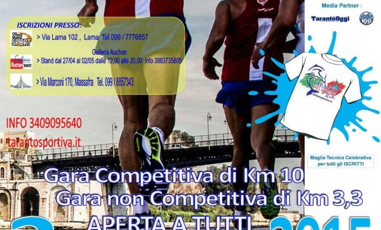 Martedì 28 aprile alle ore 10,30 presso la Galleria Auchan, è stata presentata, in conferenza stampa, la VI edizione di “Taranto nel Cuore” valida come 7^ tappa di Corripuglia, Memorial Alberto Casile. Trattasi di una manifestazione sportiva che chiama a raccolta tantissimi atleti e non, provenienti da ogni parte d’Italia organizzata dall’A.S.D. Taranto Sportiva, su mandato della Fidal con il patrocinio dell’Assessorato allo Sport del Comune di Taranto. All’incontro con la stampa, dove sono illustrati tutti i particolari, erano presenti: Giuseppe Bucci, Fabio Debellis, Nicola Micucci, per la Taranto Sportiva, gli assessori Gionatan Scasciamacchia e Francesco Cosa, rispettivamente alle Attività Produttive e allo Sport, ed il Presidente del CONI Taranto, Giuseppe Graniglia e il Direttore della Galleria Auchan Dottor Mortella. Si tratta di una Gara Podistica Regionale Fidal competitiva di corsa su strada di km 10 e non competitiva di km 3,3 aperta a tutti per correre e divertirsi tutti insieme, grandi e piccini, uomini e donne. L’appuntamento sportivo è fissato per domenica 3 maggio e si svolgerà, come da regolamento, con qualsiasi condizione atmosferica. Inizio gara alle ore 9,30 da Piazza Kennedy. Si tratta di una manifestazione sportiva di forte richiamo, motivo per far giungere a Taranto migliaia di persone che con l’occasione di fermano in città per conoscerne le sue bellezze e le sue storiche radici. Negli anni l’iniziativa ha catalizzato sempre una maggiore attenzione vedendo sempre più aumentare il numero dei partecipanti. La scorsa edizione, quella targata 2014 vinta da Francesco Minerva della Dynamic Fitness Bari, ha visto la partecipazione di oltre duemila partecipanti. Aspettative ancor più rosee per quella che ci aggiungiamo a vivere. La città in questa occasione, così come si è visto lo scorso anno, è in festa, piena di colori e calore. Una vera festa dello sport, della condivisione, dell’amicizia, ma anche del sano agonismo. Una gara che viene curata nei minimi particolari, ai partecipanti, che giungono da ogni parte d’Italia vengono offerti cestini colmi di prodotti locali di stagione. “Taranto nel Cuore” è la dimostrazione che Taranto è una meta ghiotta. Rammentiamo che la manifestazione è aperta a tutti gli atleti/e tesserati presso le società affiliate FIDAL nel 2015 delle categorie Juniores, Promesse,Seniores M/F, allievi, in regola con le norme di tutela sanitaria della pratica sportiva. Per le iscrizioni la quota di € 6,00 è da versare in unica soluzione al ritiro dei pettorali e comprende un ricco pacco gara inclusa la maglia tecnica celebrativa per tutti i partecipanti e un ristoro alla riconsegna del pettorale. Questo il programma: il raduno è fissato alle ore 7.30 in Piazza Kennedy (nei pressi del Circolo Ufficiali della M.M.), lo start sarà dato alle ore 9,30 la cerimonia di premiazione è prevista alle ore 11,00. Il percorso si snoderà interamente nel centro cittadino godendo delle bellezze e della unicità del Borgo Antico di Taranto, si attraverserà due volte il Ponte Girevole (andata e ritorno) e si percorrerà tutta la zona pedonale del Borgo Umbertino. L’intero perimetro di gara sarà ben segnalato e controllato dalle Forze dell’Ordine, dalla Protezione Civile di Taranto e dai Giudici di gara della FIDAL. L’atto di iscrizione equivale all’accettazione del regolamento e solleva gli organizzatori da ogni responsabilità per eventuali danni a persone o cose, prima durante e dopo la gara. La stessa è coperta da assicurazione RCT. Le iscrizioni dovranno pervenire entro le ore 24.00 di giovedì 30 aprile online sul sito www.fidalpuglia.it, non saranno ammesse iscrizioni, cancellazioni o modifiche il giorno della gara. Per info rivolgersi ai seguenti numeri di telefono: 338.2662211/340.9095640. E’ possibile effettuare l’iscrizione anche nei seguenti punti: