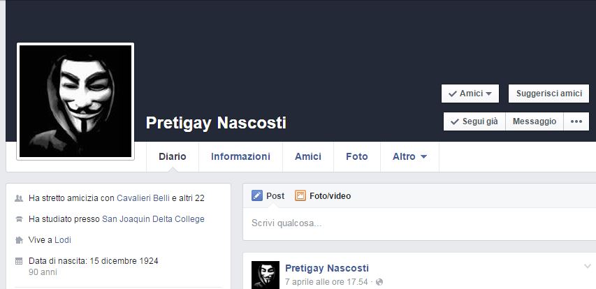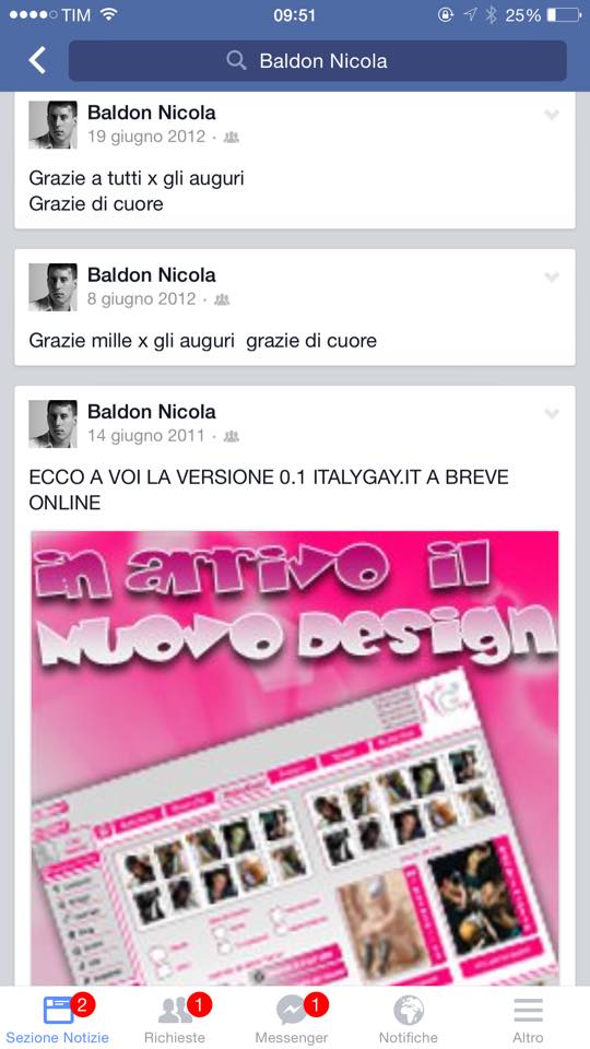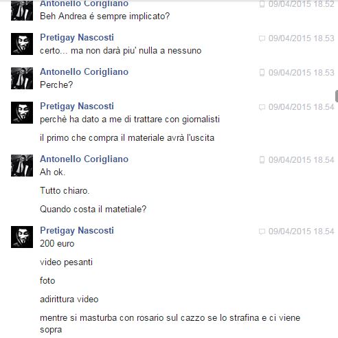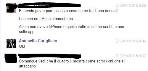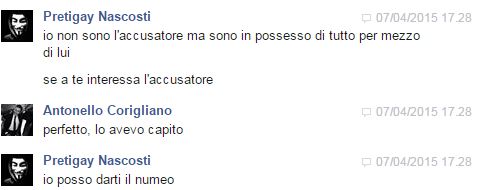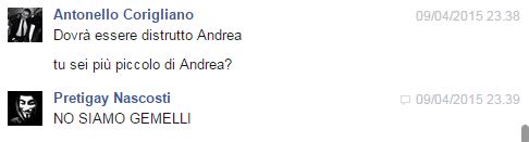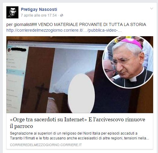 Nicola su facebook ha un profilo Pretigay Nascosti – che dopo lo scandalo fatto scoppiare a Brescia, guarda caso, lo rinomina – con il quale , il giorno dell’uscita della notizia sul Corriere del Mezzogiorno ( il 6 aprile) , ha postato le prime foto su un gruppo di facebook, Solo A Taranto, delle chat tra Andrea -suo fratello gemello- e Don Antonio Calvieri.