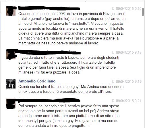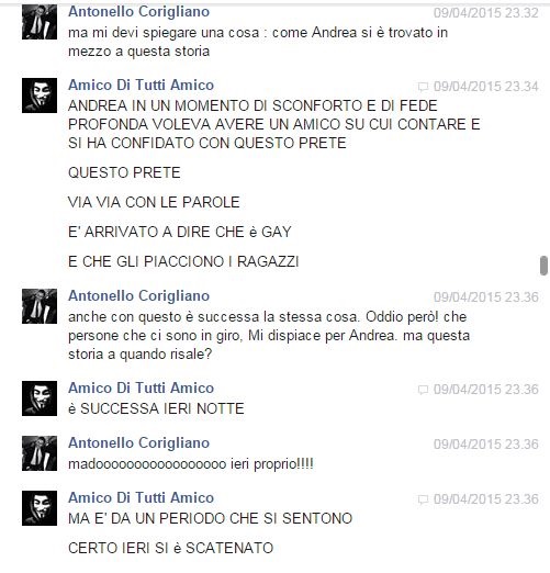 Quindi dalle conversazioni emerge che mentre Andrea si vedeva e si sentiva via internet con Don Calvieri, denunciato prima di Pasqua al tribunale ecclesiastico e presso la procura di Rovigo, si vedeva e si sentiva, sempre via facebook e skype, con un altro prete.