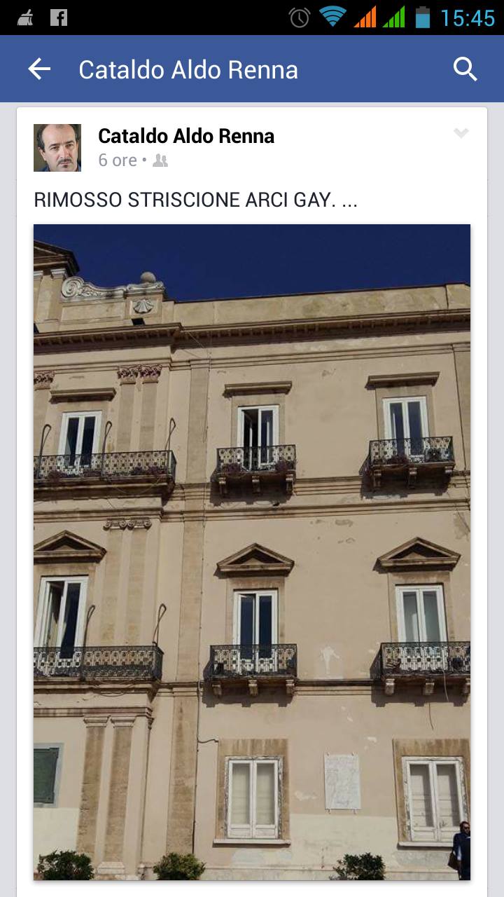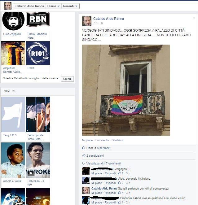 ormai), “vergognati sindaco… oggi sorpresa a palazzo di città bandiera dell’arci gay alla finestra non tutti lo siamo sindaco.” Nei commenti omofobi scritti in calce alla foto, il sindaco Stefano viene apostrofato “Ricchione” e le problematiche della comunità LGBT vengono definite di scarsa importanza. Inutile aggiungere che tale dichiarazione palesa che il consigliere comunale non fosse a conoscenza del fatto che la bandiera era lì dalle ore 12.00 di venerdì 16, ignorasse le iniziative e le campagne promosse da Arcigay Taranto (strano, dato che spesso se ne parla in Comune e, ancora più spesso, se ne legge notizia sui giornali locali; qualcuno potrebbe supporre che non si presenti alle sedute del Consiglio e che non legga i giornali) e, cosa ben più grave, non avesse mai sentito parlare dell’esistenza della Giornata Mondiale contro l’Omofobia.