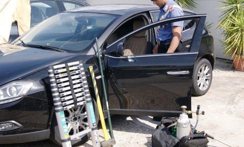 dietro i sedili posteriori, gli operanti hanno rinvenuto diversi arnesi atti allo scasso, una scala telescopica, una paletta simile a quella in uso alle Forze di Polizia con la scritta “Comune di – Polizia Municipale” e una bombola di acetilene con cannello, normalmente utilizzate dai malfattori per far esplodere i dispositivi bancomat e le colonnine self-service installate presso i distributori di carburante.