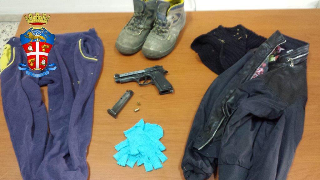 Iniziata la battuta, in pochi minuti veniva rintracciato, bloccato ed arrestato uno di due rapinatori, che dopo essersi spogliato degli indumenti utilizzati durante la rapina, cercava di trovare riparo tra l’erba alta del vasto appezzamento. A circa cinquanta metri da lui, lungo il percorso che lo riportava alla motocicletta abbandonata, venivano ritrovati gli indumenti dei quali i due soggetti si erano disfatti, passamontagna e guanti compresi, ma soprattutto l’arma utilizzata e l’intero maltolto.