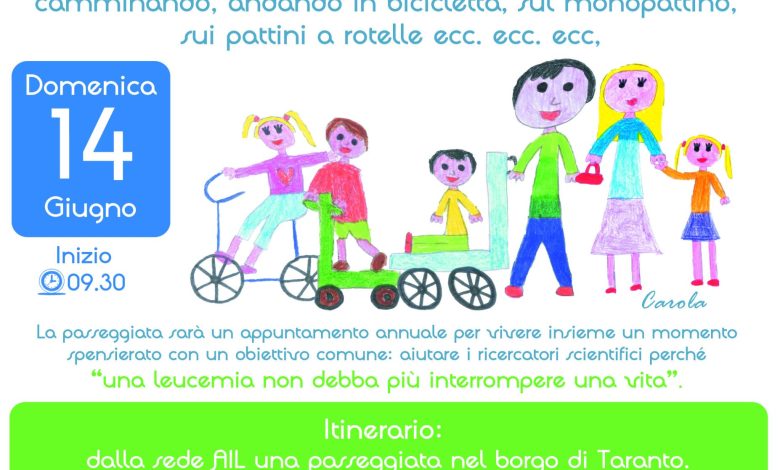 In occasione della Giornata Nazionale contro le Leucemie, la sezione dell’AIL di Taranto organizza domenica 14 Giugno 2015 la prima edizione della “Passeggiata Obiettivo Salute”, una camminata benefica per le vie del borgo cittadino aperta a tutti, famiglie, singoli, gruppi, anche provvisti di qualunque mezzo ecologico non inquinante.