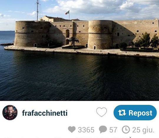 E’ il commento che il famoso showman Francesco Facchinetti ha scritto sotto una foto scattata da lui e caricata sul profilo di instagram che ritrae il Castello Aragonese visto dal ponte girevole . ” Sto girando un film a Taranto: CITTA’ SPETTACOLARE . Come al solito quello che ci vogliono far credere non corrisponde alla verità!”