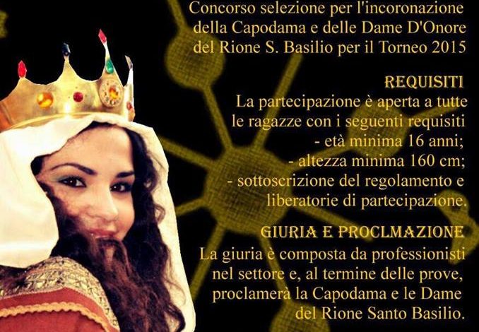 Domenica 26 luglio, alle ore 21:00, a conclusione della giornata di festa “San Basilio Day”, il rione giallo-nero di Oria eleggerà la sua damigella d’onore per il Corteo Storico e Torneo dei Rioni di sabato 8 e domenica 11 agosto 2015. La partecipazione alla competizione “Non Solo Belle” è aperta a tutte le ragazze di almeno 16 anni, alte più di 160 cm. Le aspiranti capodame, che saranno valutate da una giuria composta da Gino Capone, ideatore del Torneo dei Rioni, e da professionisti del settore, e che oltre a sfilare, dovranno dar prova di capacità e talento, con breve interviste e con un’esibizione in una specialità a scelta (canto, danza, poesia, ecc.). Durante la serata ci sara’ anche lo spettacolo per bambini “Mattia mano per mano show”. Presenta la serata Annagrazia Angolano.