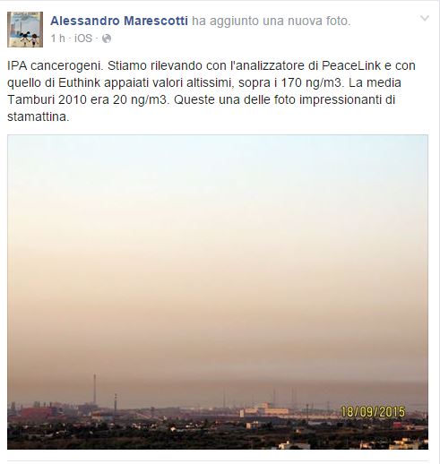 Da quanto si legge sulla pagina di facebook di Alessandro Marescotti – presidente di PeaceLink – i taranti stamane starebbero respirando una quantità di ipa ( idrocarburi policiclici aromatici) cancerogeni e genotossici in quantità impressionante.