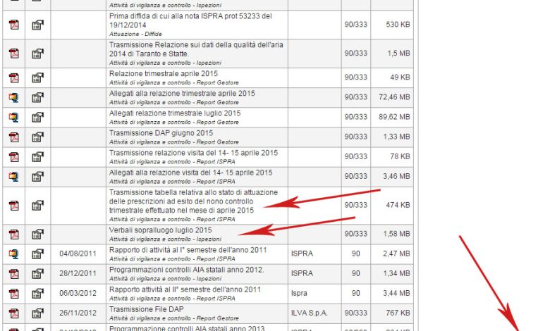 Per essere sempre sicuri ed aggiornati su quanto Ispra vuole comunicarci ci premuriamo di conservare le schermate video in merito a quanto accade sul sito del Ministero, questo semplicemente perchè ci siamo accorti che alcuni documenti che sono, diciamo, “in ritardo” alcune volte vengono pubblicati con date non effettivamente corrispondenti alla data di pubblicazione, in altri casi, proprio come sta accadendo con questi ultimi documenti, si preferisce omettere la data. Succede quindi che navigando sulla pagina che elenca tutti i documenti relativi all’AIA Ilva, a piè di pagina troviamo gli ultimi pubblicati in ordine cronologico, in questo caso i documenti del gestore Ilva in merito alle relazioni trimestrali, mentre per quanto riguarda quelli di Ispra relativi alle ispezioni si deve risalire la pagina perchè questi sono pubblicati senza data e quindi non sono in ordine temporale. Nell’era dell’open source e della politica all’insegna dell’amministrazione trasparente tutto ciò non ha una spiegazione.